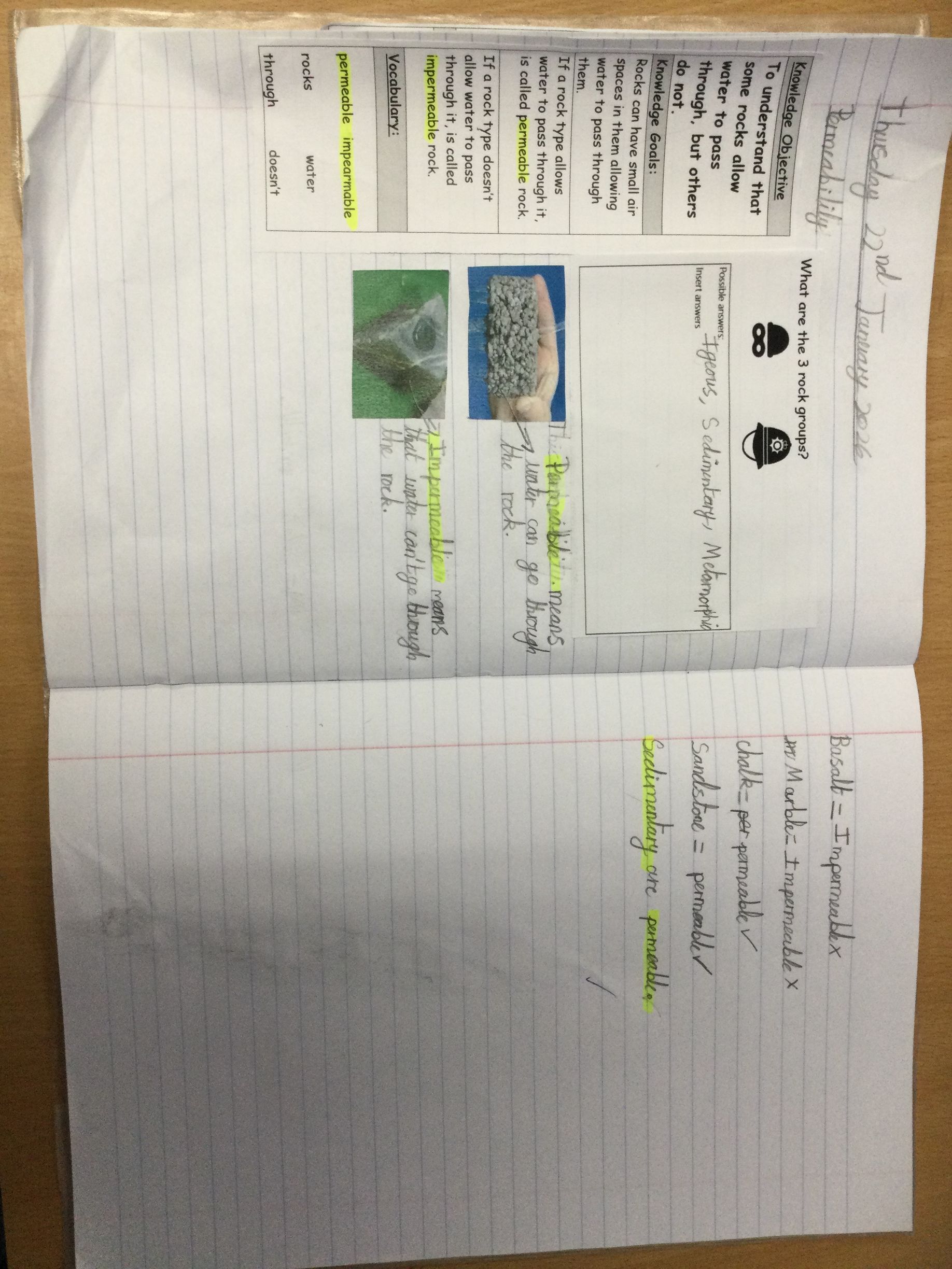 In Science, we have been investigating rocks. We tested which rocks are permeable and impermeable ð§â. We discovered that sedimentary rocks are all permeable, which was very interesting!